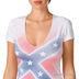 Модная белая майка с принтом в виде английского флага. Рукава короткие. Вырез горловины V-образный. Снизу надпись Denny Rose.