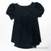 Модель с рукавами-фонариками и широким округлым вырезом горловины украшено декоративной аппликацией на полочке. Подол на спинке удлинен, на спинке горизонтальная сборка резинкой.