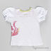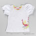 Футболка прямого кроя с рукавами-фонариками. Круглая горловина украшена ярко-зеленой тесьмой. На спинке кокетка с полосатой подкладкой. На боку аппликация.