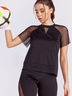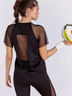 Футболка для занятий фитнесом прямого кроя с круглой горловиной с декоративным манжетом в нижней части изделия и разрезами по бокам. Благодаря комбинации со стрейч-сеткой декоративная V-образная вставка в верхней части полочки, по центру спинки и короткому широкому рукаву-реглан изделие приобретает свою изюминку. А комфорт обеспечивается благодаря качественному хорошо растяжимому материалу.