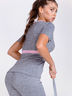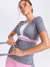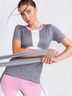 Футболка приталенного силуэта с втачным коротким рукавом, круглой горловиной и фигурными подрезами по полочке, а разделительная горизонтальная вставка контрастного цвета подчеркивает линию груди и визуально сужает талию. Максимальный комфорт достигается правильно подобранной качественной тканью, которая не сковывает движения и плоскими швами.