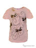 Футболка с коротким рукавом, рукав и бока стянуты декоративной резиночкой и украшены бантиками. Футболка украшена стразами и апликацией. Оттенок может отличаться от представленного на фото!