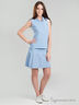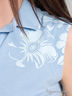 Фактурная низкоэластичная хлопковая ткань. Без рукавов. Отложной воротник, застежка на полочке на пуговицы. Декоративная отстрочка оката рукавов. На полочке принт контрастного цвета в виде цветов.