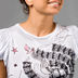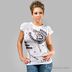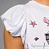 Стильная трикотажная футболка с круглым вырезом горловины и рукавами-фонариками. Спереди оригинальный принт, декорированный рюшами и бусинами.