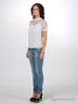 Футболка из вискозного трикотажа. Кокетка и рукав-реглан выполнены из кружевной ткани. Планка-застежка с пуговицами на спинке. Низ изделия посажен на резинку.