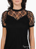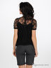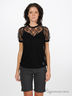 Футболка из вискозного трикотажа. Кокетка и рукав-реглан выполнены из кружевной ткани. Планка-застежка с пуговицами на спинке. Низ изделия посажен на резинку.