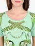 Детали: V-образный вырез горловины, короткий рукав, полочка украшена аппликацией и стразами