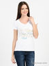 Отличная футболка из тонкого эластичного трикотажа. V-образный вырез горловины, короткий рукав, полочка декорирована принтом со стразами. Молодежный повседневный вариант.