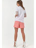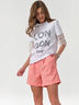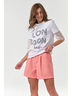 • Особенности: Футболка прямого силуэта из трикотажа. Детали: горловина обработана широкой окантовкой, по низу рукавов притачано кружево, по переду нанесен принт.