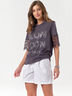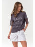 • Особенности: Футболка прямого силуэта из трикотажа. Детали: горловина обработана широкой окантовкой, по низу рукавов притачано кружево, по переду нанесен принт.