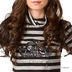 Стильное трикотажное платье в горизонтальную полоску с короткими рукавами и свободным воротником-стойкой. На груди аппликация из пайеток и фирменный логотип.