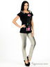 Детали: округлый вырез декорирован складками, рукава-фонарики на резинке дополнены рюшами, полочка декорирована набивным рисунком и стразами