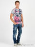Детали: округлый вырез горловины, короткий прямой рукав, полочка декорирована набивным рисунком.