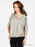 Детали: изделие с короткими, цельнокроеными рукавами и V-образным вырезом горловины, полочка декорирована прошитыми складками