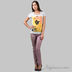 Стильная трикотажная футболка серого цвета с коротким рукавом. Округлый вырез горловины. Полочка декорирована ярким принтом со стразами. Вырез горловины и низ футболки выполнены в несколько слоев ткани с необработанными краями.