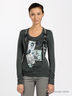 Трикотажный лонгслив из изумительно нежного, приятного на ощупь материала. Широкая круглая горловина. Длинные рукава. На полочке оригинальный принт и нашивки, декорированные стразами и бусами.