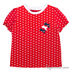 Яркая красная футболка для девочки, в мелкий принт. Справа на груди декорирована маленькими бантиками. Очень нарядная и романтичная модель. Понравится любой девочке.