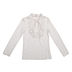 Футболка прямого кроя с длинным рукавом. Небольшой ворот-стойка продолжается декоративными лентами, завязывающимися в бантик. Ворот и полочка декорированы рюшами.