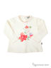 Замечательная футболка из мягкого хлопка - олицетворение изящества. На передней части изделия неброский принт с цветочным мотивом, оформленный вышивкой и пайетками, придающими изделию деликатное сияние. Аккуратный круглый воротник оформлен фестонами. Застежка на спинке делает процесс одевания-раздевания очень комфортным и приятным.