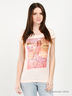 Великолепная футболка из тонкого хлопкового трикотажа. Округлый вырез горловины. Короткие рукава, декорированные оборками. На полочке крупный печатный рисунок.