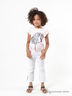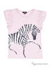 Футболка выполнена из стрейчевой приятной к телу ткани. Короткие рукава в форме крылышек украшены рюшами. Модель декорирована оригинальным принтом. В такой футболке будет удобно и комфортно в летние дни!