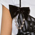 В коплект входит трикотажная футболка с надписью на груди с круглым вырезом горловины и черный топ - сетка. Декоративный бант с бусами отстегиваются. Такой комплект можно носить как вместе так и отдельно друг от друга.