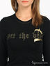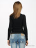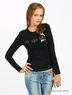 Классическая футболка из трикотажной хлопковой ткани с длинным рукавом. Неглубокий округлый вырез горловины. Декоративная прострочка контрастной нитью горловины, низа рукавов и низа изделия. На полочке нашивка-аппликация с металлическими клепками.