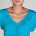 Изящная однотонная футболка с V-образным вырезом и небольшими рукавами, декорированная сборками на груди, выгодно подчеркивающими Вашу фигуру. Очень красивый, летний вариант.