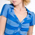 Женская рубашка-поло синего цвета из тонкого и мягкого трикотажа. Отложной воротник. Кокетка на спинке. На полочке изделия расположена планка-застежка на пуговицах.