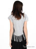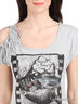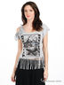 Детали: короткий рукав, правый рукав с вырезом, полочка декорирована аппликацией и стразами, декоративная бахрома