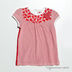 Футболка для девочки свободного кроя. Круглый вырез горловины окантован с фигурным перекручиванием, с застежкой на спинке. Короткие рукава присборены на плечах. Украшена текстильной брошью.