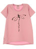 Футболка с укороченным передом. Спереди стильный принт со стразами. Рукава короткие. Изготовлена из кулирки с эластаном.