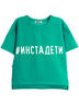 Футболка со спущенный плечом, перед укорочен, свободного силуэта. По переду стильный принт. Изготовлена из кулирки с эластаном.