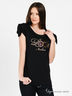 Модная футболка с округлым вырезом горловины и коротким рукавом реглан с завязками. Полочка украшена вышивкой и стразами. Отличный вариант для создания стильного образа.