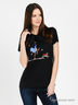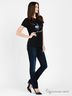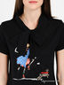 Модная футболка с оригинальным воротом и коротким рукавом. Полочка украшена принтами, тканевым бантиком и стразами. Отличный вариант для создания стильного образа.