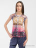 Очаровательная футболка с короткими рукавами и округлым вырезом горловины. Изделие выполнено из принтованной ткани контрастной расцветки. Отличный вариант на каждый день.