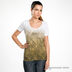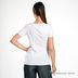 Футболка женская классического кроя белая. Округлый вырез горловины. Декорирована принтом и стразами по всей передней части изделия.
