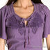 Женская трикотажная футболка прямого кроя. Ворот сзади посажен на многорядную резинку. На полочке небольшой вырез на завязках. Рукава реглан. На груди декоративная вышивка. Завязки декорированы кисточками.