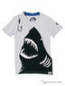 Практичная летняя футболка из высококачественного натурального материала с короткими рукавами и округлым вырезом горловины. Модель украшена принтом в виде акулы, что придает изделию оригинальный вид, сзади внизу вставка из контрастного материала.Прекрасный выбор!