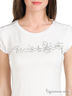 Детали: округлый вырез горловины дополнен трикотажной лентой, полочка декорирована стразами в виден надписи логотипа бренда