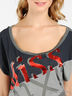 Детали: круглый вырез, оригинальные короткие рукава, спереди украшена принтом, по бокам присборена на резинки