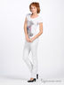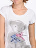 Футболка из тонкого трикотажа. Классический крой. Короткий рукав. Округлый вырез горловины окантован трикотажной резинкой в мелкий рубчик. Полочка изделия декорирована рисунком-аппликацией и стразами.
