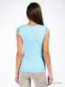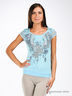 Футболка прямого покроя из нежного, приятного на ощупь материла. Круглая горловина. Кокетка и короткие рукава выполнены из кружева. Низ изделия посажен на трикотажную резинку. На полочке принт украшенный стразами.