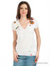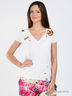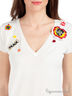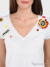 Детали: V-образный вырез горловины, короткий рукав, изделие украшено множеством декоративных элементов и брошью