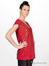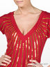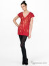 Трикотажная ткань в мелкий рубчик. Свободный, слегка приталенный силуэт. Короткий рукав. Глубокий V-образный вырез горловины. Низ изделия "посажен" на широкую резинку из основной ткани в два сложения. Полочка декорирована пайетками, расположенными в виде лучей, исходящих от выреза горловины.