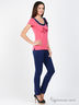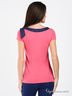 Детали: округлый вырез горловины контрастного цвета с бантом, короткий рукав, полочка украшена вышивкой и нашивкой