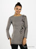 Мягкая футболка с длинным рукавом станет прекрасным дополнением к повседневному гардеробу. Прямого кроя. Очень мягкая и приятная на ощупь, тонкая трикотажная ткань. Округлый вырез горловины на трикотажной ленте. Длинный прямой рукав и низ изделия обработаны оверлоком. Полочка декорирована трикотажной рюшей. На правом боку лента со стразами.