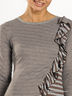 Мягкая футболка с длинным рукавом станет прекрасным дополнением к повседневному гардеробу. Прямого кроя. Очень мягкая и приятная на ощупь, тонкая трикотажная ткань. Округлый вырез горловины на трикотажной ленте. Длинный прямой рукав и низ изделия обработаны оверлоком. Полочка декорирована трикотажной рюшей. На правом боку лента со стразами.