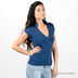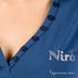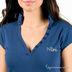 Футболка с V-образным вырезом, украшенным пуговицами и воротом- иммитацией стойки. Полочка декорирована логотипом марки из стаз.