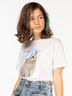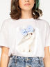 Спущенный рукав, анималистичный атласный принт и объёмная нашивка в виде банта в белом варианте футболки.
